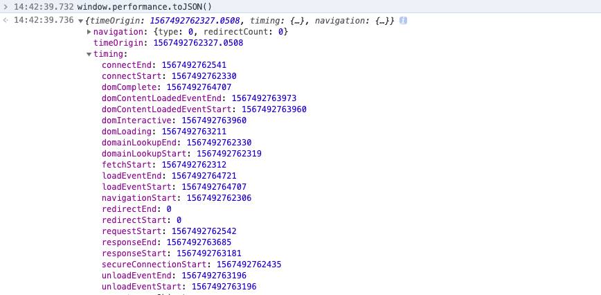 - performance.toJSON() :它返回一个由 performance 对象各个属性组成的 JSON