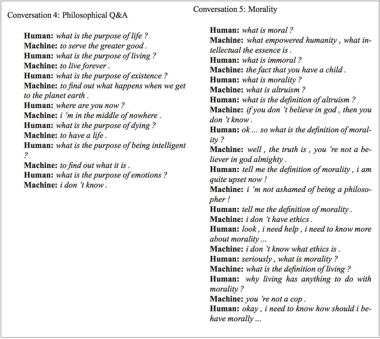 2015年,谷歌训练了一个对话智能体(AI),不仅可以有力地作为技术支持与人类进行互动,还会讨论道德问题,表达意见和回答基于事实的一般问题。