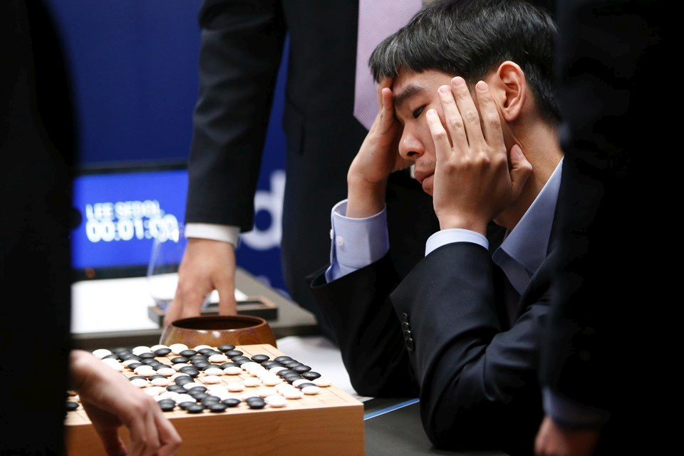 围棋职业选手李世乭在战败后复查了它与 AlphaGo 的对弈。图片来自 Atlantic。