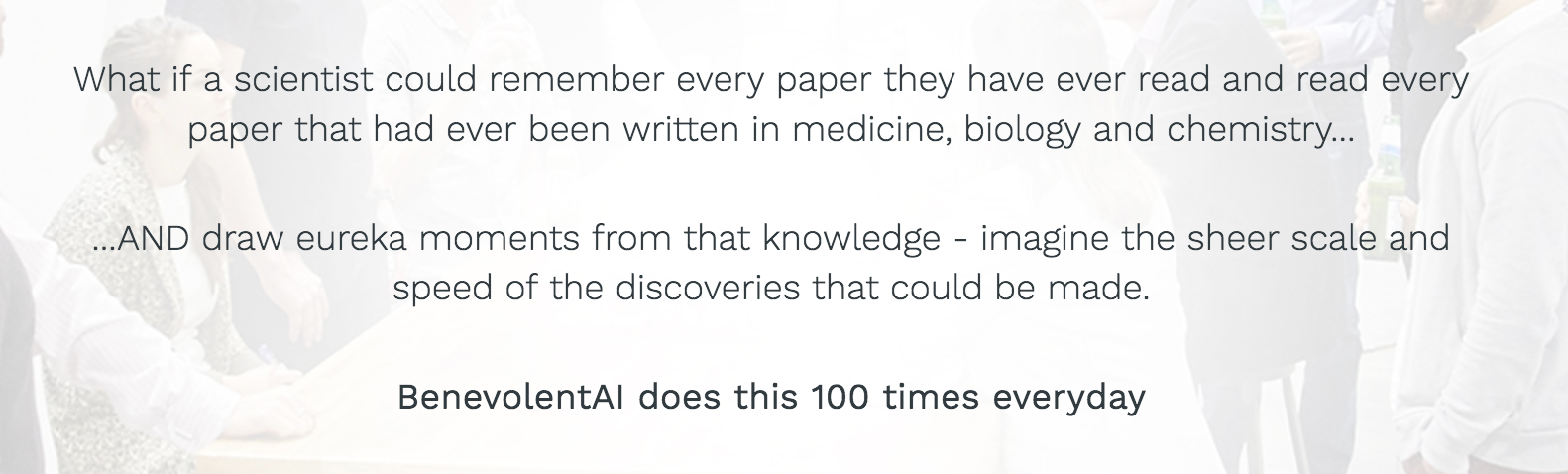 伦敦的 Benevolent AI(来自“关于我们”页面的截图,2017 年 8 月)的大胆公告。