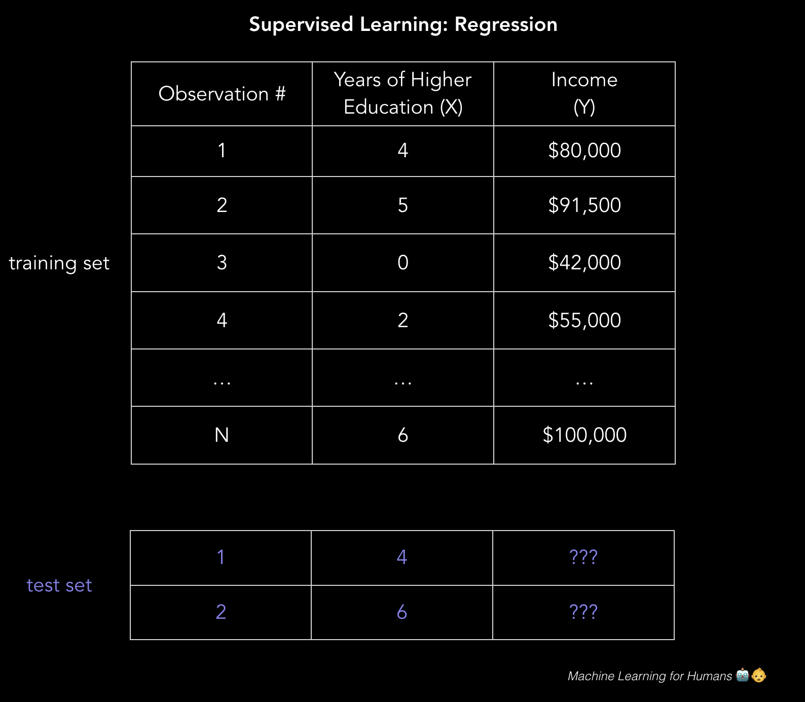 Y_train = [80, 91.5, 42, 55, …, 100] # 对应的年收入,单位为千美元