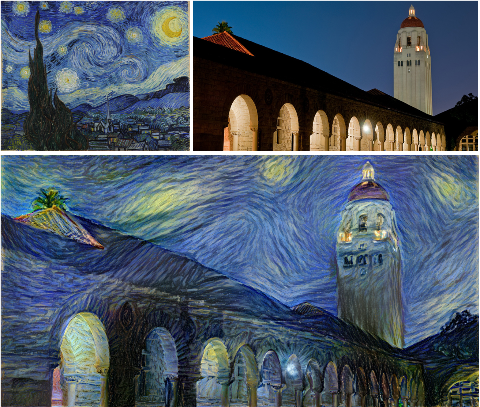 梵高的《星夜》的风格应用于斯坦福校园的图像上,通过 Justin Johnson 的 neural style 实现:https://github.com/jcjohnson/neural-style