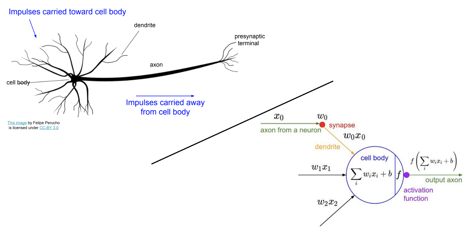 生物和人工神经网络的端到端的演示,来自斯坦福 CS231n。这个比喻不是很严谨,生物神经元可以做人工神经元不能做的事,反之亦然。但是理解生物中的灵感十分有用。更多细节请见生物和人工神经元的维基百科的描述。