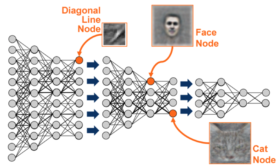 生物神经网络表现出的层次结构最早于 1950s 发现,当研究员 David Hubel 和 Torsten Wiesel 研究猫的视觉皮层中的神经元的时候。在给猫大量刺激之后,它们不能观察到神经活动:暗点、亮点、挥手、甚至是杂志上的女性照片。但是在它们的失望中,它们从投影仪中移除了对角线处的照片,它们注意到了一些神经活动。结果是,位于某个特定角度的,对角线上的边能够导致特定的神经元被激活。