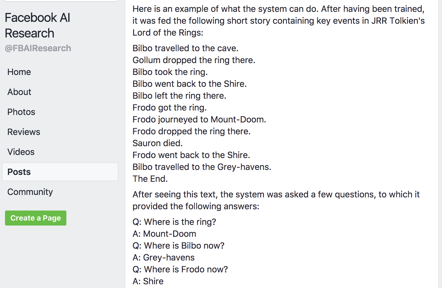 Fackbook 训练了一个神经网络,由短时记忆加持,来智能地回答《指环王》情节中的问题。