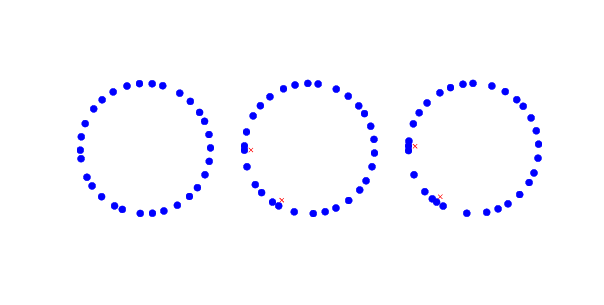 图 10.1:三个时间点中,环形公路上的驾驶员的模拟。 点表示驾驶员的位置;十字表示驾驶员必须刹车来避开另一个驾驶员。