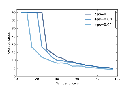 最上面那行显示eps = 0的结果;也就是说,速度没有随机变化。 如果汽车数量少于 25 辆,则汽车之间的间隔大于 40,这样汽车可以达到并保持 40 的最大速度。超过 25 辆汽车形成交通堵塞,平均速度迅速下降。