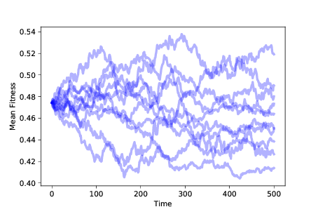 图?显示了运行这个模拟 10 次的结果。 种群的平均适应性随机移动。 由于适应性的分布随时间变化,我们推断表现型的分布也在变化。 按照最具包容性的定义,这种随机游走是一种进化。 但它不是一个特别有趣的类型。