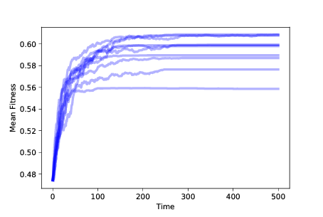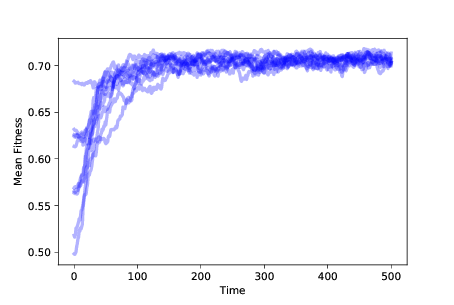 图?显示了随着时间的推移,10 次模拟中的适应性均值,带有生存差异。 平均适应性起初会迅速增加,但会逐渐平稳。