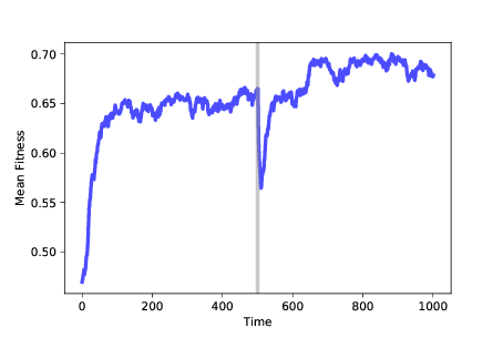 经过 500 步之后,我们运行FitnessLandscape.set_values,这改变了适应性景观; 然后我们恢复模拟。 平均适应性会立即下降,因为旧景观中的最佳位置并不比新景观中的随机位置好。