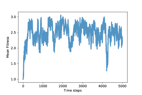 模拟的其余部分变化很大,但除了一次大的下降之外,平均适应性通常在 2 到 3 之间,长期平均值接近 2.5。