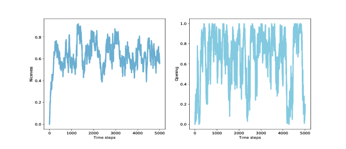 为了深入了解这种适应性水平,我们来看看更多的仪器。Niceness在每个时间步骤之后测量智能体的基因型的合作比例:
