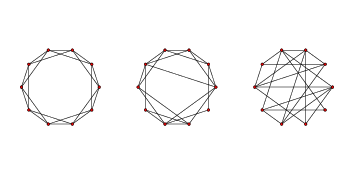 n,每个节点连接k个邻居。选择边的子集,并将它们替换为随机的边来“重新布线”。