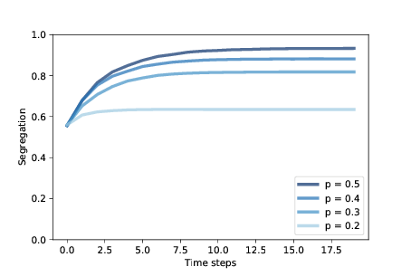 图?显示了隔离程度如何增加,以及它在几个p值下的平稳位置。 当p = 0.4时,稳定状态下的隔离程度约为 88%,且大多数智能体没有不同颜色的邻居。