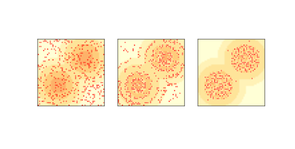 图 9.5:Sugarscape中的波动行为:初始状态(左),6 步后(中)和 12 步后(右)