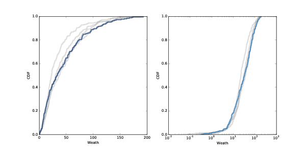 在对数刻度上,分布的形状类似于高斯或正态分布,但右尾被截断。 如果它在对数刻度上实际上是正态的,则分布是对数正态分布,这是一种重尾分布。 实际上,几乎每个国家和全世界的财富分布都是重尾分布。