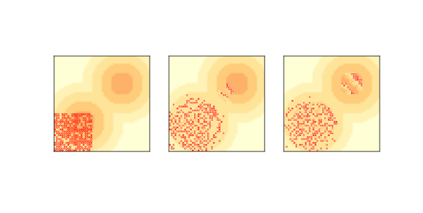 图?(左)展示了初始状态,最黑暗的区域表示容量最高的细胞,小圆圈表示智能体。