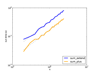 我写了三个连接列表的函数:sum_plus使用+=;sum_extend使用list.extend;sum_sum使用sum。 我在n的范围内对它们计时,并将结果绘制在双对数刻度上。 下图展示了结果。