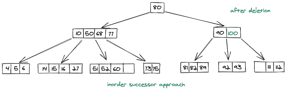 如果我们想删除一个存在于内部节点中的键,那么我们可以取这个键的顺序前置的值,或者如果取那个顺序前置违反了 B 树属性,我们可以取这个键的顺序后续。