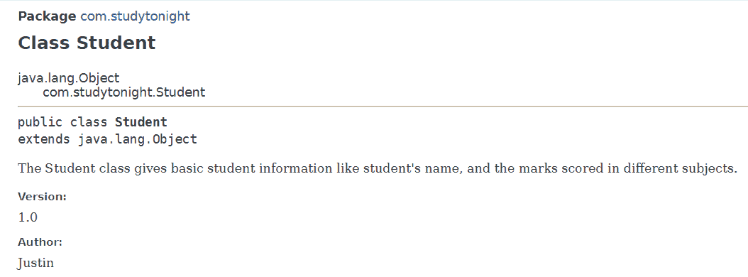 让我们创建一个学生类,并向其中添加 Javadoc 注释。我们将包括对课程的简要描述。我们还将添加@author 标签来设置类的作者名,并添加@version 标签来指定类的版本。