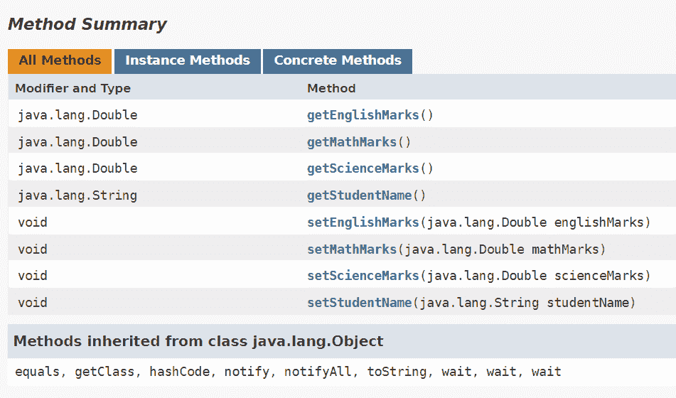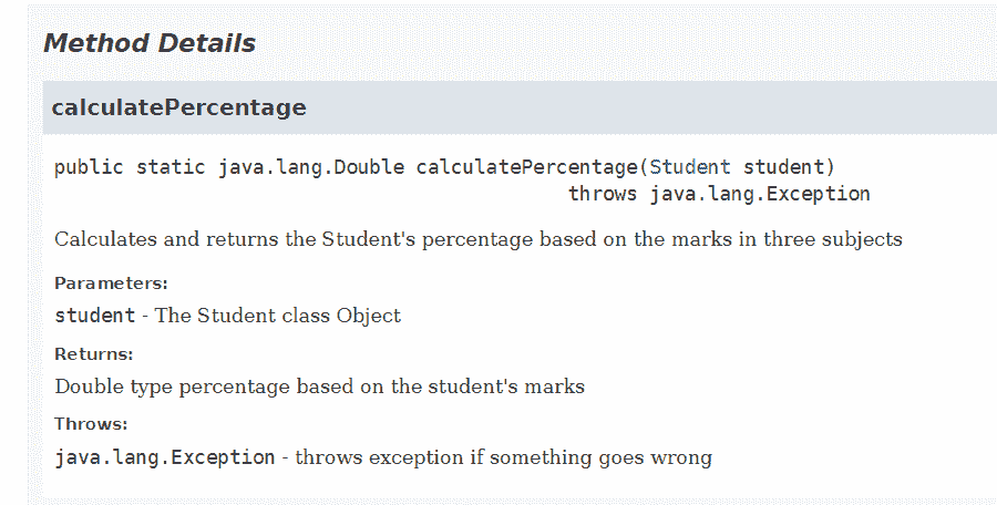 我们将创建一个新类,并向该类添加一个方法。这种方法计算学生的百分比。让我们查看这个方法的 Javadoc 注释。