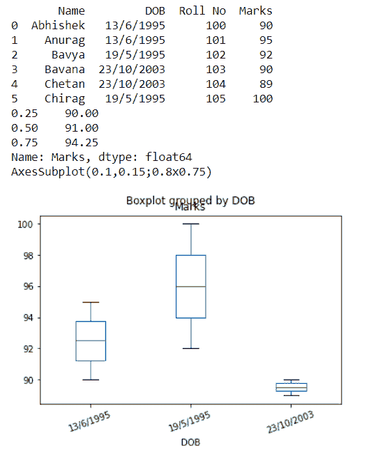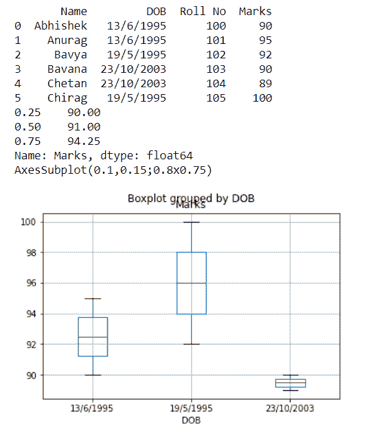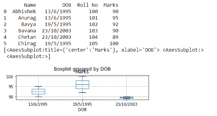 df = pd.DataFrame([['Abhishek','13/6/1995',100,90], ['Anurag','13/6/1995',101,95],['Bavya','19/5/1995',102,92],['Bavana','23/10/2003',103,90],['Chetan','23/10/2003',104,89],['Chirag','19/5/1995',105,100]], columns=['Name','DOB','Roll No','Marks'])