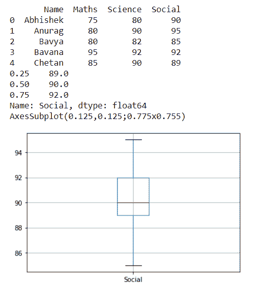 考虑DataFrame.boxplot()方法如何工作的一个简单例子。通过将数据帧列的名称传递给DataFrame.boxplot()方法,创建一个数据帧并生成箱折线图。