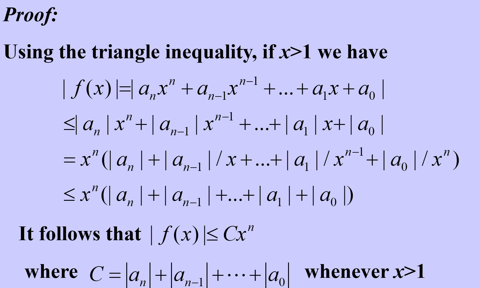 Let $f(x)=anx^n+a{n-1}x^{n-1}+...+a_1x+a_0$, where $a_i(i=1,2,3,...)$ are real numbers, then f(x) is $O(x^n)$