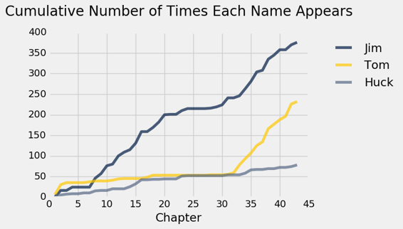 《哈克贝利·芬历险记》描述了哈克和吉姆沿着密西西比河的旅程。汤姆·索亚(Tom Sawyer)在行动进行的时候加入了他们的行列。在加载文本后,我们可以快速地看到这些字符在本书的任何一处被提及的次数。