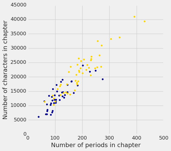 在下面的图中,每本书的每一章都有一个点。 蓝色圆点对应于《哈克贝利·芬》,金色圆点对应于《小女人》。横轴表示句号数量,纵轴表示字符数。