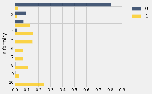 Class和Uniformity列显示为数字,但他们真的都是类别值。 这些类别是“癌症”(1)和“非癌症”(0)。 Uniformity为 1-10,但是这些标签是由人确定的,他们也可能有十个标签,如“非常一致”,“不一致”等等。 (一致性的 2 不一定是 1 的两倍。)所以我们比较两个类别分布,每个分类一个。