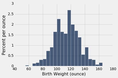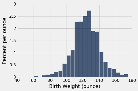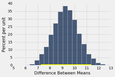 不吸烟的母亲的婴儿比吸烟的母亲的婴儿平均重 7.2 盎司到 11.4 盎司。 这比“两个分布不同”更有用。 由于置信区间不包含 0,它也告诉我们这两个分布是不同的。 所以置信区间估计了我们的均值之间的差异,也让我们决定两个基本分布是否相同。