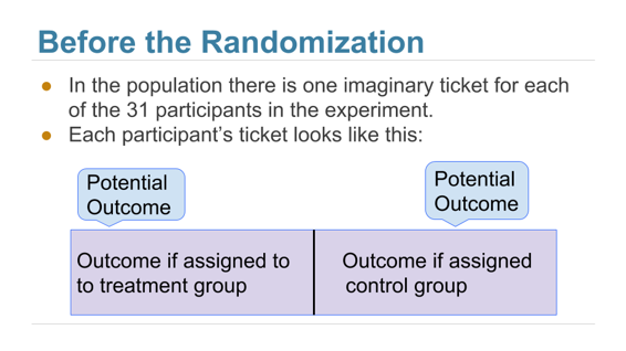 在患者随机分为两组之前,我们的大脑本能地想象出每个患者的两种可能的结果:患者分配到实验组的结果,以及分配给对照组的结果。这被称为患者的两个潜在的结果。