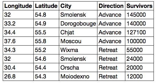 这里是 Minard 数据的一个子集,取自 Leland Wilkinson 的 The Grammar of Graphics。