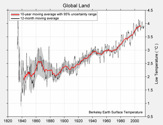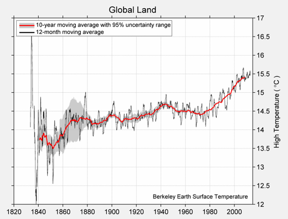 返回到温度数据,我们创建 1850 年,1900 年,1950 年和 2000 年的几十年间,日平均高温的数组。