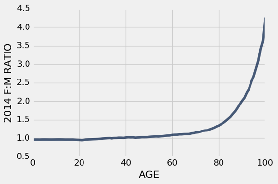 - 在 89 岁和 90 岁中,比例接近 2,这意味着 2014 年这些年龄的女性约为男性的两倍。