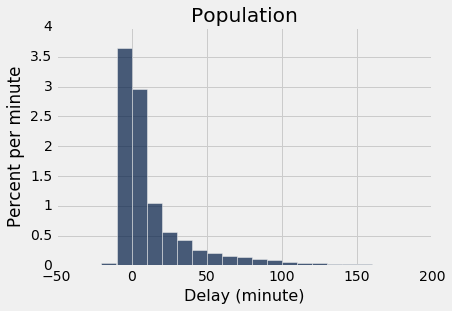 现在让我们将这 13,825 个航班看做一个总体,并从中带放回地抽取随机样本。 将我们的分析代码打包成一个函数是有帮助的。 函数empirical_hist_delay以样本量为参数,绘制结果的经验直方图。