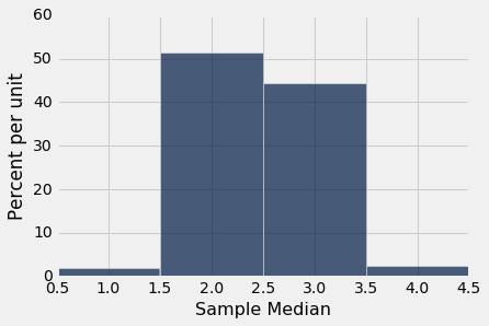 如果我们能够生成所有可能的大小为 1000 的随机样本,我们就可以知道所有可能的统计量(样本中位数),以及所有这些值的概率。我们可以在统计量的概率直方图中可视化所有值和概率。