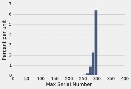 与所有涉及随机抽样的代码一样,运行该单元几次;来查看变化。你会发现,即使只有 300 个观测值,最大的序列号通常在 250-300 范围内。