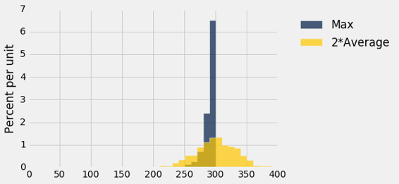 maxes = np.append(maxes, sampled_numbers.column(0).max())