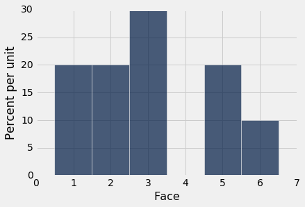 这是十次投掷的经验直方图。 它看起来不像上面的概率直方图。 运行该单元格几次,看看它如何变化。