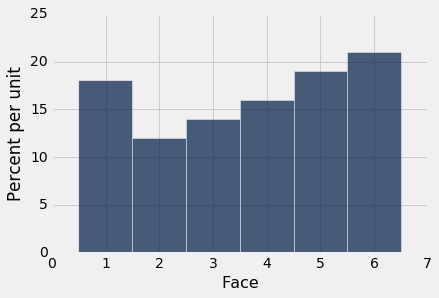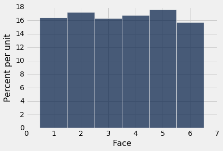 在继续之前,让我们确保轴域上的数字是有意义的。每个面的概率是 1/6,四舍五入到小数点后两位的概率是 16.67%。每个桶的宽度是 1 个单位。所以每个条形的高度是每单位 16.67%。这与图形的水平和垂直比例一致。