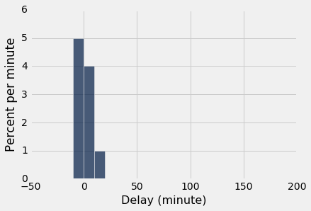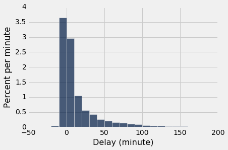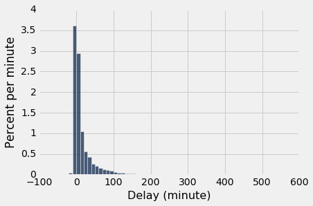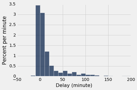 united.sample(n).select('Delay').hist(bins = delay_bins, unit = 'minute')