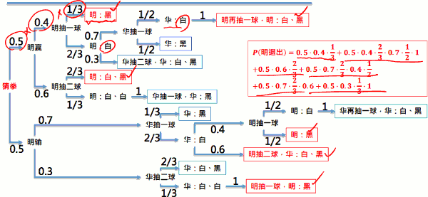 - 已知猜拳输赢机率为 0. 5,每次明取球取一颗之机率为 0. 4,取两颗机 率为 0. 6 。每次华取球取一颗之机率为 0. 7,取两颗机率为 0. 3。