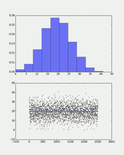 interval = [int(np.random.normal(mu, sigma)) for i in xrange(NN)]