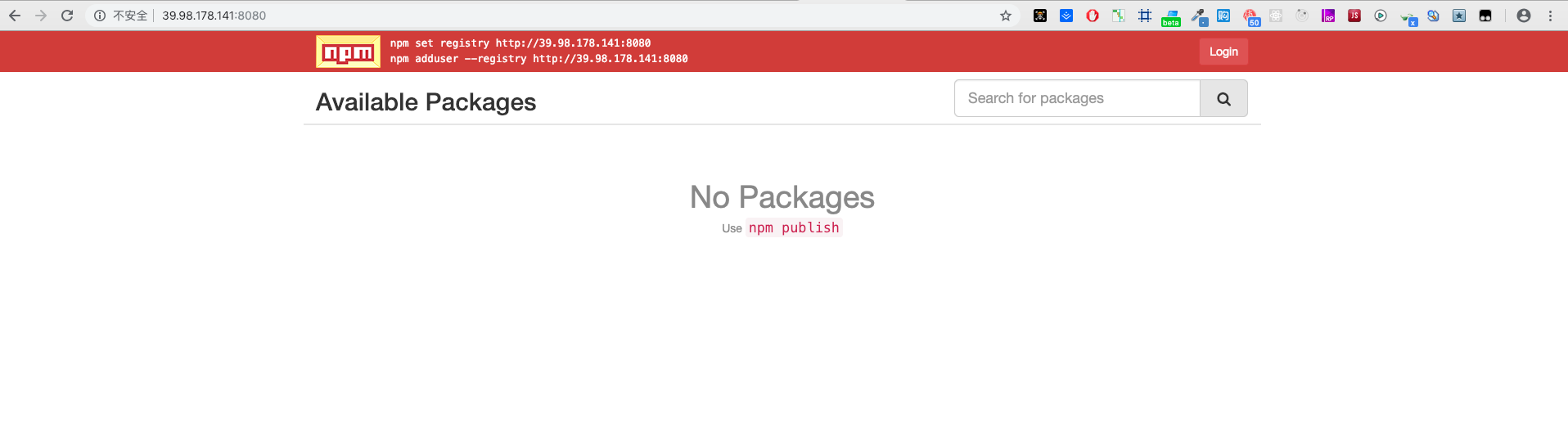 访问 http://39.98.178.141:8080 地址出现下图 ,sinopia 安装成功了!