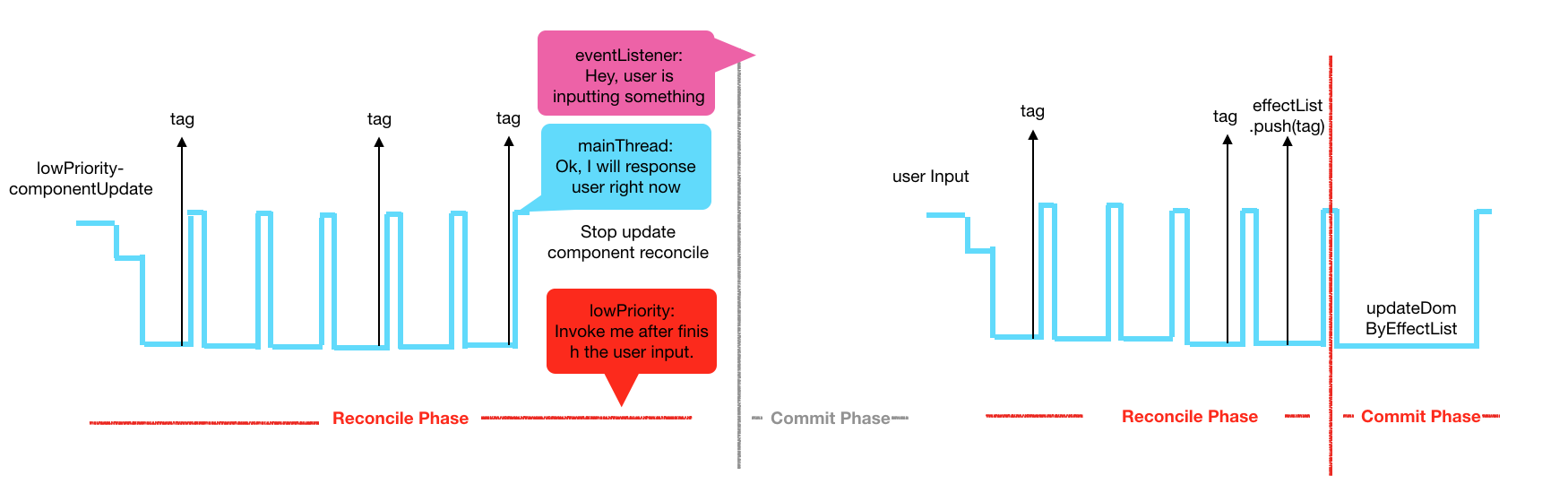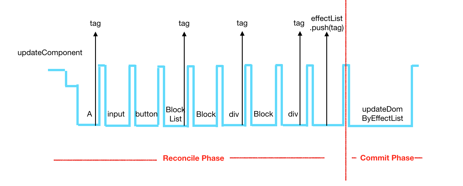 - Reconcile 阶段。此阶段中,依序遍历组件,通过 diff 算法,判断组件是否需要更新,给需要更新的组件加上 tag。遍历完之后,将所有带有 tag 的组件加到一个数组中。这个阶段的任务可以被打断。