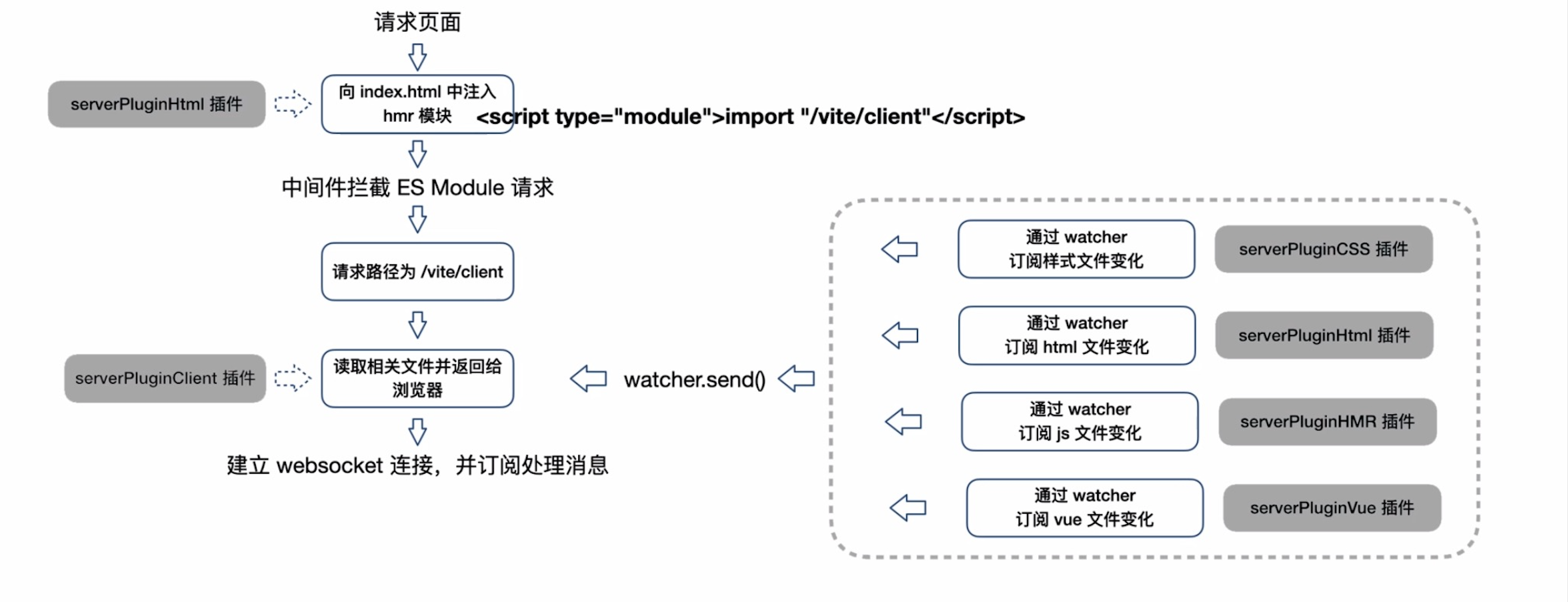 1.处理 esm 语法 2. 对.ts,.vue 等文件进行实时编译 3. 对 less/sass 的需要预编译的模块进行编译 4. 和浏览器简历 socket 链接实现 HMR